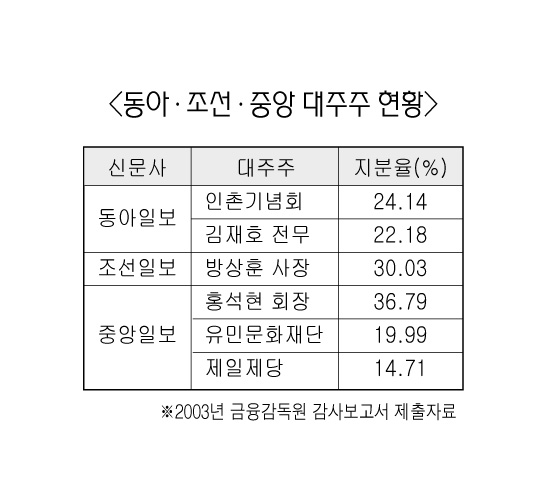 이 감사보고서에 따르면 동아일보의 경우 1대주주가 인촌기념회(24.14%)로 2대주주인 김재호 전무(22.18%)보다 주식지분율이 1.96%포인트 더 많았다. 중앙일보의 5% 이상 주주의 주식소유현황(보통주와 우선주를 포함)은 홍석현 회장이 주식지분율 36.79%로 1대주주, 유민문화재단이 19.99%로 2대주주로 나타났다. 뒤를 이어 제일제당 14.71%, CJ개발 7.30% 등의 순이었다. 조선의 감사보고서는 방상훈 사장(30.03%)의 주식지분율만 공개돼 있을 뿐 나머지 주식을 누가 얼마나 소유하고 있는지는 기재되지 않았다.