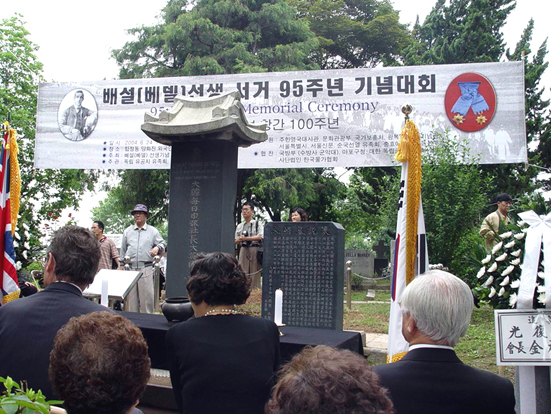 베델(배설)선생기념사업회는 24일 서울 양화진 외국인 묘지공원에서 ‘베델 선생 서거 제95주년 기념대회’를 개최했다. 이날 추모식은 크리스토퍼 로빈스 주한영국대리대사를 비롯해 장충식 단국대학교 이사장, 서울신문 채수삼 사장 등 1백여명이 참석한 가운데 열렸다.