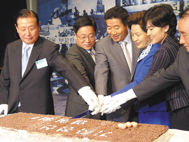 노무현 대통령 내외와 이상기 기자협회장, 김원기 국회의장 등이 함께 시루떡을 자르고 있다. 시루떡에는 “기자정신 영원히”라는 글귀가 쓰여져 있다.