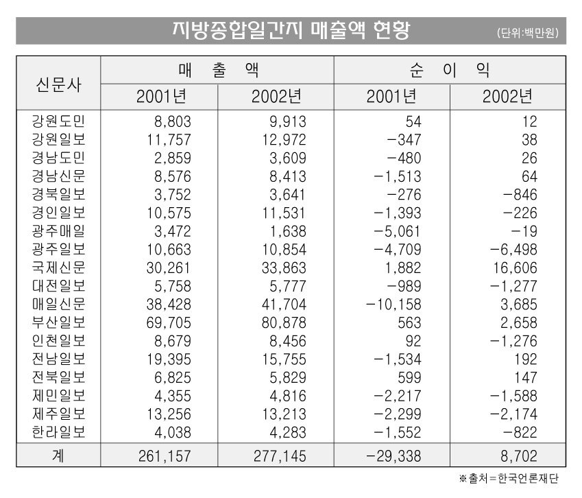 윤전기가 있는 신문사는 인쇄사업과 출판사업을 병행해 그나마 광고비 절감으로 인한 부족분을 메우고 있고 일부 신문사들의 경우 은행돈을 차입해 신문사 유지에 안간힘을 쏟고 있는 형편이다.