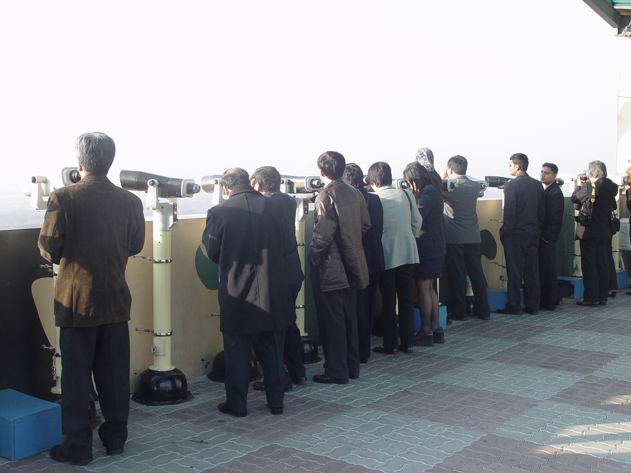망원경으로 북한 지역을 보고 있는 포럼 참가자들.