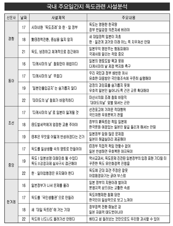 동아일보는 16일부터 22일까지 매일 사설을 통해 일본의 ‘다케시마의 날’을 철회하라고 촉구했다. 19, 22일자 사설에서는 차분한 대응책도 주문했다.