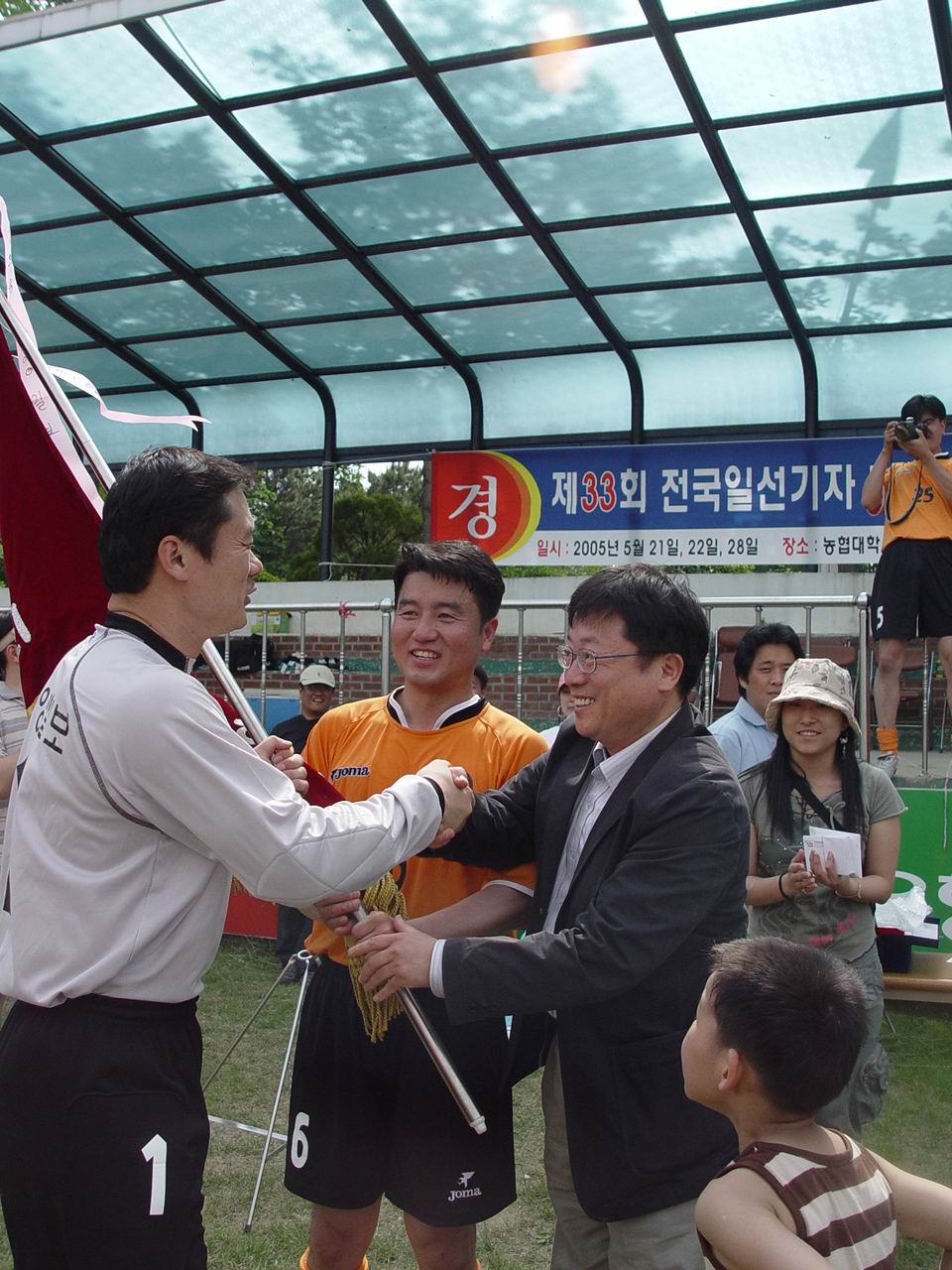 제33회 전국일선기자 친선축구대회 서울지역 우승팀인 중앙일보가 이상기 기자협회장으로부터 우승기를 받고 있다.