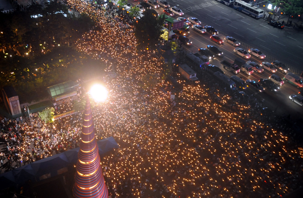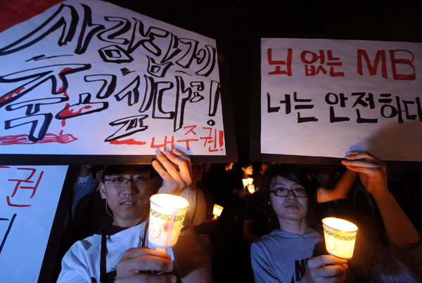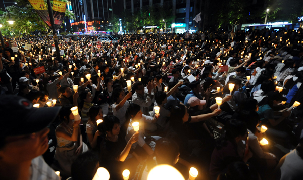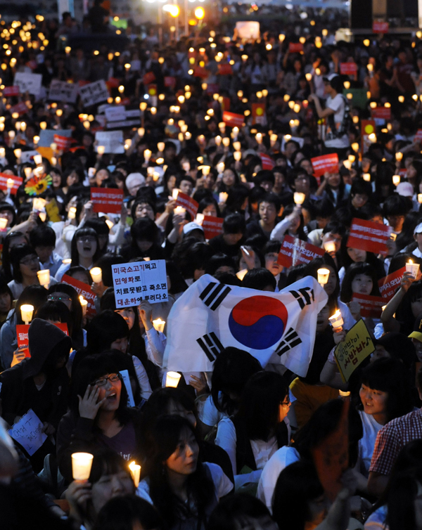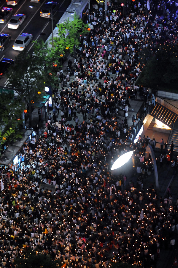 | ▲ 미국산 쇠고기 수입 반대 촛불 문화제가 열린 5일 오후 서울 파이낸스센터 앞에서 21세기 한국대학생연합 소속 대학생들을 비롯한 시민들이 촛불을 들고 구호를 외치고 있다. ⓒ뉴시스 | ||