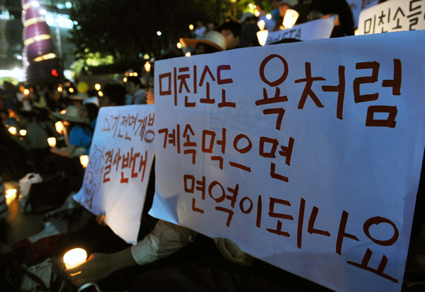 | ▲ (미국산 쇠고기 수입 반대) 많은 시민들과 학생들이 참가한 가운데 2일 저녁 서울 청계광장 일대에서 '미국산 쇠고기 수입 재개 규탄 촛불 문화제'가 열리고 있다. ⓒ뉴시스 | ||
