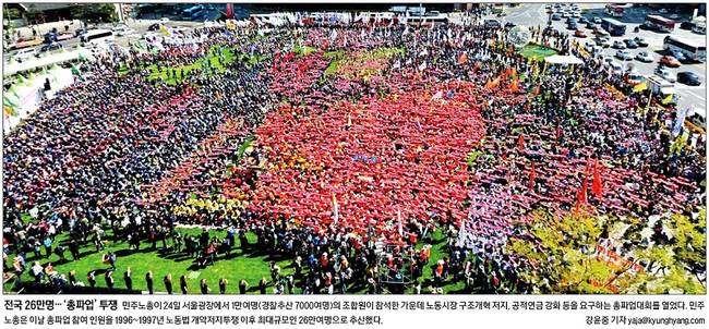 민주노총이 노동시장 구조개혁 저지, 공적연금 강화 등을 요구하며 24일 총파업을 벌였다. 경향신문, 세계일보, 한국일보는 이날 서울광장에서 1만여명(경찰추산 7000여명)의 조합원이 참석한 가운데 열린 총파업대회 사진을 1면에 보도했다. 경향에 따르면 민주노총은 이날 총파업 참여 인원을 1996~97년 노동법 개악저지투쟁 이후 최대 규모인 26만여 명으로 추산했다.