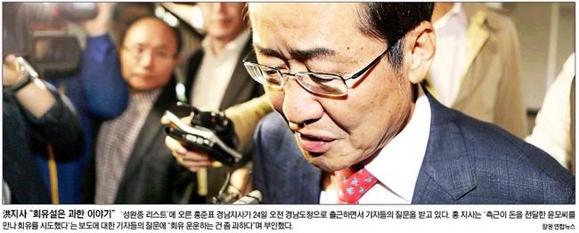 서울신문은 ‘성완종 리스트’에 오른 홍준표 경남도지사의 24일 출근길을 보도했다. 홍 지사는 측근이 성완종 전 회장의 돈을 전달한 윤모씨를 만나 회유를 시도했다는 의혹을 받고 있다. 홍 지사는 그러나 “회유 운운하는 건 좀 과하다”며 부인했다.