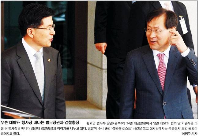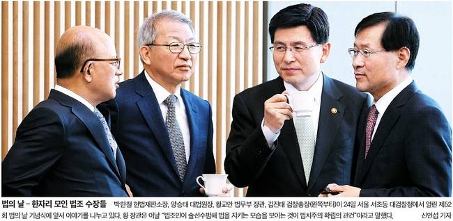24일 법의 날을 맞아 법조계의 수장들이 한 자리에 모였다. 중앙일보는 박한철 헌법재판소장, 양승태 대법원장, 황교안 법무부장관, 김진태 검찰총장이 서울 서초동 대검찰청에서 열린 제52회 법의 날 기념식에 참석해 이야기를 나누는 사진을 1면에 실었다. 국민일보는 기념식을 마친 뒤 행사장을 떠나며 담소를 나누는 황 장관과 김 총장의 사진을 놓고 ‘무슨 대화?’라는 의문을 달았다.