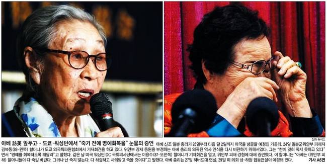 조선일보와 동아일보는 아베 신조 일본 총리의 미국 방문을 앞두고 24일 일본군위안부 피해자 할머니들이 기자회견을 하는 사진을 1면에 실었다. 조선일보에 따르면 위안부 피해자인 김복동 할머니는 이날 도쿄 외국특파원협회에서 기자회견을 열어 “한이 맺혀 죽지 못하고 있다”며 “명예를 회복하도록 해달라”고 말했다. 같은 날 미국 워싱턴DC 국회의사당에서는 이용수 할머니가 기자회견을 열고 위안부 피해 경험에 대해 증언했다. 이 할머니는 “아베는 (위안부 피해) 할머니들이 다 죽길 바란다. 그러나 난 죽지 않는다. 다 해결하고 사죄받고 죽을 것이다”라고 말했다. 아베 총리는 26일부터 다음달 2일까지 미국을 방문해 27일 하버드대 연설, 29일 미 의회 상·하원 합동연설을 할 예정이다.