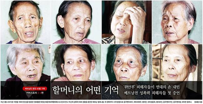 한겨레는 위안부 할머니들만큼이나 오랫동안 정신적·육체적 고통과 상처를 끌어안고 살아왔던 베트남전 성폭력 피해자 할머니들의 육성과 사진을 토요판 커버스토리로 보도했다. 한겨레는 베트남전 종전 40돌 기획으로 정대협(한국정신대문제대책협의회)의 윤미향 대표가 지난 3월 4박5일간 베트남전 당시 빈딘성의 안년시(옛 안년현)와 뚜이프억현, 푸깟현 일대에서 한국군에 의해 성폭력 피해를 입었다는 할머니들을 만나 인터뷰한 기록을 실었다. “당사자들이 실명과 얼굴을 드러내고 당시 정황과 실상을 밝히기는 이번이 처음”이라는 한겨레 설명이다.