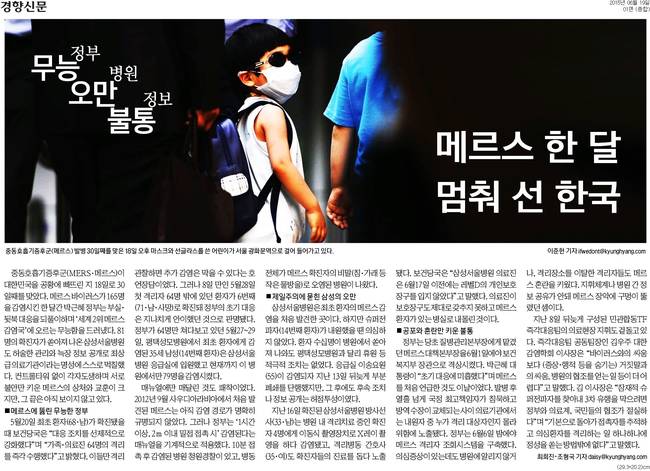 경향신문은 이날 메르스가 대한민국을 공황에 빠뜨린 지 30일째를 맞았지만 정부는 부실-뒷북 대응을 되풀이하며 무능함을 드러냈다고 보도했다.