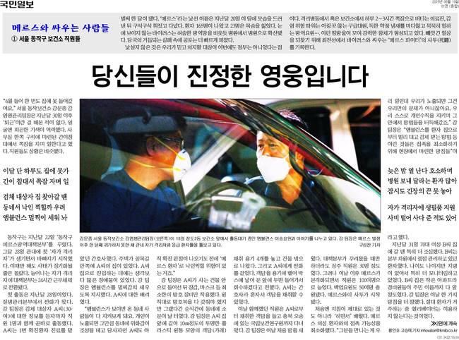 국민일보는 메르스와 싸우고 있는 서울 동작구 보건소 직원들의 모습을 담았다. 이들은 이달 단 하루도 집에 못가고 간이침대서 쪽잠을 자며 일을 하고 있다고 전했다.