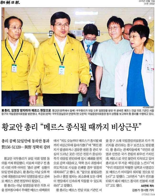 동아일보와 서울신문, 세계일보, 조선일보, 한국일보는 임명장을 받자마자 메르스 현장을 방문한 황교안 국무총리의 모습을 담았다.
