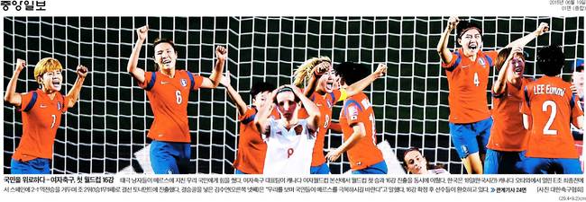 중앙일보와 한겨레는 캐나다 여자월드컵 본선에서 월드컵 첫 승과 16강 진출을 동시에 이룬 여자축구 대표팀의 모습을 전했다. 태극낭자들이 메르스에 지친 우리 국민에게 힘을 줬다고 덧붙였다.