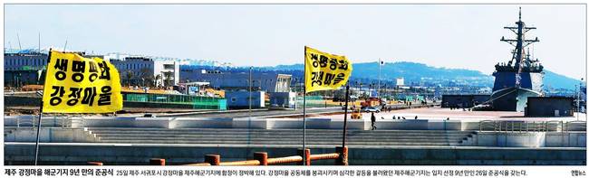 강정마을 공동체를 붕괴시키며 심각한 갈등을 불러왔던 제주해군기지는 입지 선정 9년만인 26일 준공식을 갖는다는 경향신문은 전했다.
