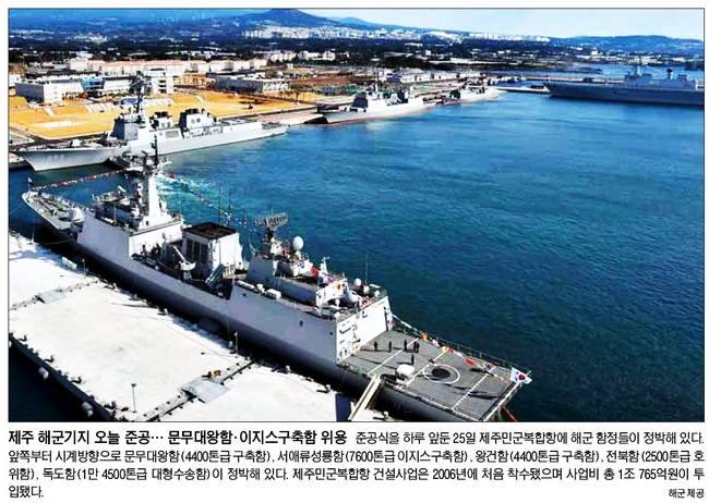 이곳 해군기지에는 지난해 이지스함 서애 류성룡함(7600t급)을 비롯해 구축함 왕건함과 문무대왕함(4400t급), 209급(1200t) 잠수함을 보유한 잠수함전대로 구성된 제7기동전단이 배치됐다.