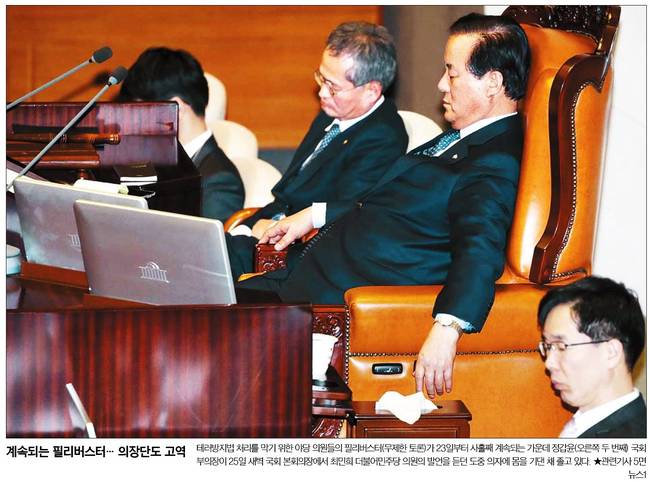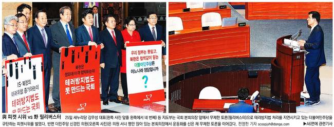 동아일보는 25일 새누리당 김무성 대표 등 지도부가 국회 본회의장 앞에서 무제한 토론(필리버스터)으로 테러방지법 처리를 지연시키고 있는 더불어민주당을 규탄하는 피켓시위 장면과 더민주당 신경민 의원 등이 국회 본회의장에서 운동화를 신은 채 무제한 토론을 이어가는 장면을 실었다.