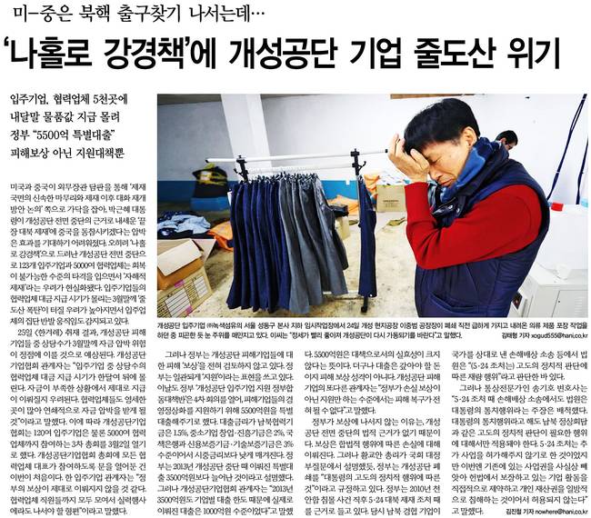 한겨레는 "'나홀로 강경책'으로 드러난 개성공단 전면 중단으로 123개 입주기업과 5000여 협력업체는 회복이 불가능한 수준의 타격을 입으면서 '자해적 제재'라는 우려가 현실화됐다"고 전했다.