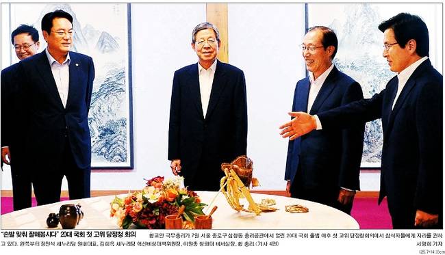 국민일보는 황교안 국무총리가 7일 서울 삼청동 총리공관에서 열린 당정청 회의에서 정진석 새누리당 원내대표, 김희옥 새누리당 현식비상대책위원장, 이원종 청와대 비서실장 등 참석자에게 자리를 권하는 모습을 신문 1면 사진으로 선택했다. 국민은 관련기사에서 “20대 국회 첫 고위 당정청 회의가 7일 개최됐다. 당 지도부가 바뀌고 청와대 참모진이 개편된 이후 열린 첫 공식 회의”라며 “당정청은 ‘함께 힘을 합쳐 나가자. 하나가 되자’며 협력강화를 한목소리로 외쳤다. 추가경정예산 조기편성, 4대 개혁 및 주요 경제법안 신속 추진 등의 의견도 같이 했다”고 전했다.