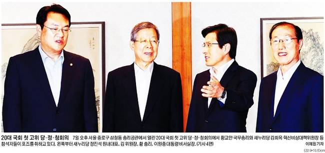 20대 국회 들어 첫 고위 당정청 회의가 7일 서울 종로구 삼청동 총리 공관에서 열렸다. 참석자들은 노동개혁 4대 법안과 규제프리존특별법 등을 올해 정기국회(9월) 전에 최우선 처리하고, 추가 경정예산안도 이달 말까지 국회에서 처리하기로 뜻을 모았다. 8일 일부 주요 일간지들은 이 같은 소식과 함께 관련 사진을 신문 1면에 내걸었다.