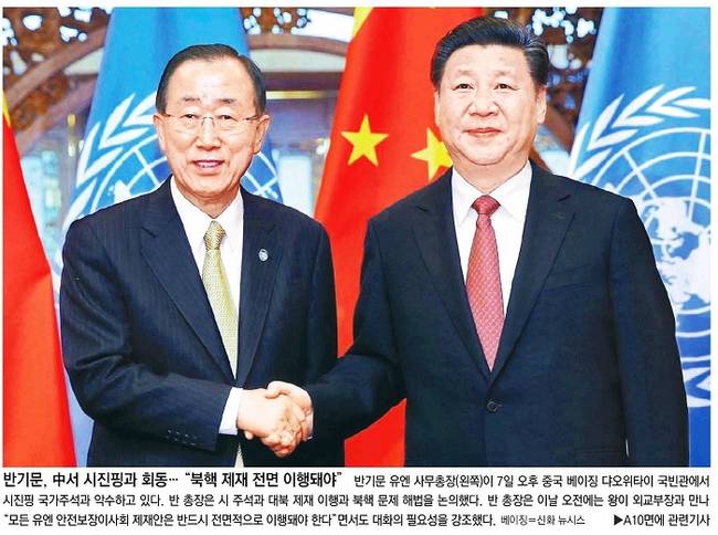 동아일보는 중국을 방문 중인 반기문 유엔 사무총장이 시진핑 국가주석과 만나 논의한 주요 현안들을 전하며 두 인물이 만나 악수하는 모습을 대문사진으로 선택했다. 동아는 관련기사에서 “중국을 방문 중인 반기문 유엔 사무총장이 7일 오후 베이징 댜오위타이 국빈관에서 시진핑 국가주석과 만나 북한 핵문제와 남중국해 문제, 기후변화 협약 등에 대해 폭넓게 대화를 나눴다”고 게재했다. 동아는 “시 주석은 ‘다양성은 세계 전진의 동력이자 원천으로 각국은 반드시 국정 상황에 맞는 발전의 길을 걸어가야 한다’고 말했다고 CCTV는 전했다.