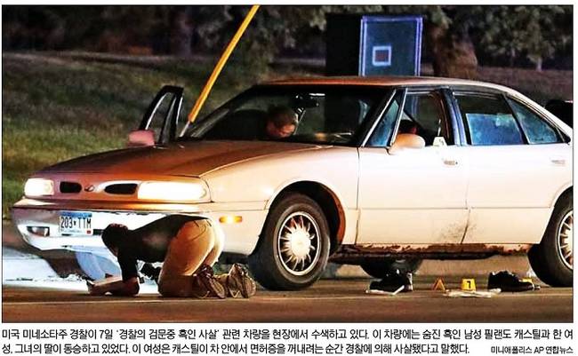 서울은 “7일(현지시간) CNN 등에 따르면 지난 6일 밤 9시쯤 미니애폴리스 중심가에서 동쪽으로 약 8Km떨어진 팰컨 하이츠 지역에서 흑인 남성 필랜도 캐스틸(32)가 경찰의 총격을 받아 병원으로 옮겨졌지만 결국 숨졌다”면서 “총을 쏜 경찰 등은 모두 영상녹화용 카메라를 몸에 장착하지 않은 상태였다”고 게재했다. 그러면서 “이 장면은 숨진 남성과 동승했던 여성이 소셜네트워크서비스 ‘페이스북’의 영상중계 기능을 사용해 온라인에 올리면서 파문이 확산됐다”고 덧붙였다.