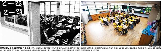 조선일보는 7월 시행된 ‘맞춤형 보육’과 관련해 70년대 아이들로 가득찬 교실과 현재 텅 빈 초등학교 교실을 담은 사진을 1면에 나란히 배치하며 관련 소식을 전했다. 조선은 관련기사에서 “7월 시행된 ‘맞춤형 보육’을 두고 어린이집들은 최근 ‘절대 반대’ 피켓을 들고 거리로 나섰다. 전국 시립 유치원들도 ‘재정지원을 해달라’며 한때 집단 휴원도 불사하겠다는 입장을 보였다. 모두 경영난을 호소하는 것인데, 근본적인 이유는 아동들이 줄었기 때문”이라고 전했다. 그러면서 “한 세대 만에 출생아 수가 반 토막 난 ‘저출산 쇼크’가 취학 전 아동 교육기관에서 먼저 나타나기 시작한 것”이라고 부연했다.