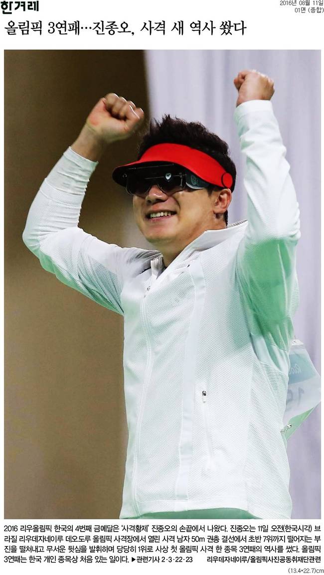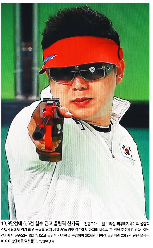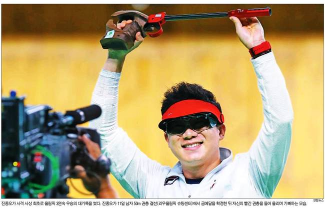 경향신문은 “진종오는 2008년 베이징, 2012년 런던 올림픽에 이어 사상 최초 올림픽 3회 연속 금메달을 따는 금자탑을 세웠다”며 “한국 선수가 올림픽에서 3회 연속 금메달을 따낸 것도 진종오가 처음”이라고 설명했다.