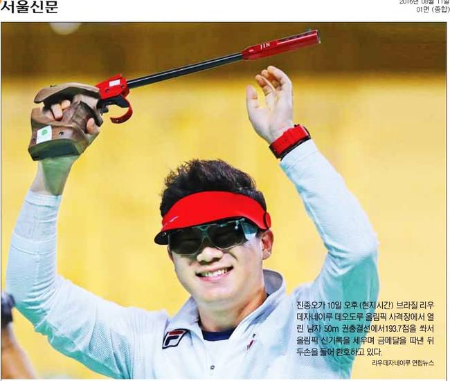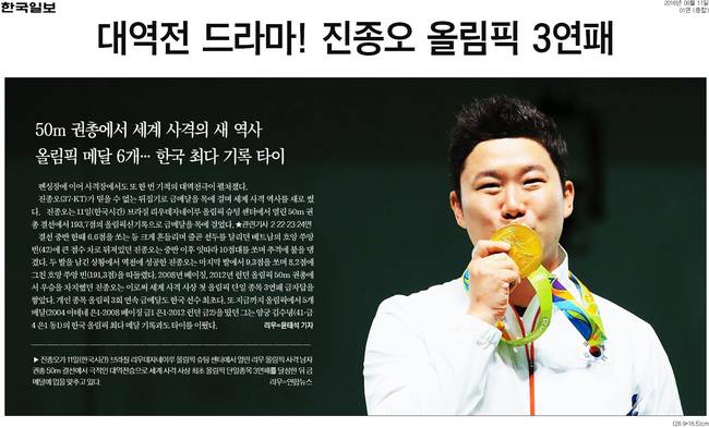 최고의 총잡이 진종오가 세계 사격 역사를 새로 썼다. 진종오는 11일 브라질 리우데자네이루 올림픽 사격센터에서 열린 남자 50m 권총 결선에서 193.7점으로 금메달을 차지했다. 이날 경향신문과 동아일보, 서울신문, 조선일보, 중앙일보, 한겨레, 한국일보 등 대다수 조간신문들은 진 선수의 3연패 소식을 1면 사진에 담았다.