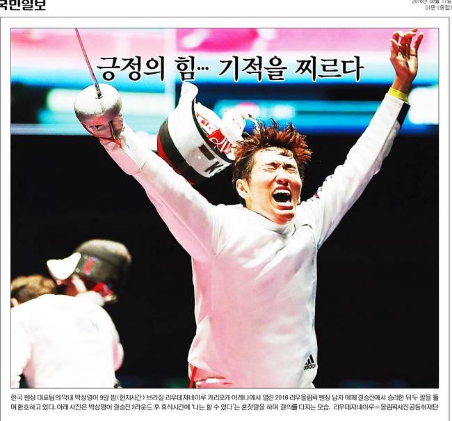 이날 국민일보와 세계일보는 펜싱 에페에서 대역전극을 펼친 박상영 선수의 모습을 1면 사진으로 담았다. 국민일보는 “스코어는 9-13. 상대방인 게자 임레에게 두 점만 더 빼앗기면 바로 지는 절체절명의 위기 상황에 박상영은 끝까지 포기하지 않은 채 머릿속을 비웠다”며 “비어진 머리에 오로지 이길 수 있다는 긍정의 생각만 주문 걸 듯 채우고 있었다”고 설명했다.
