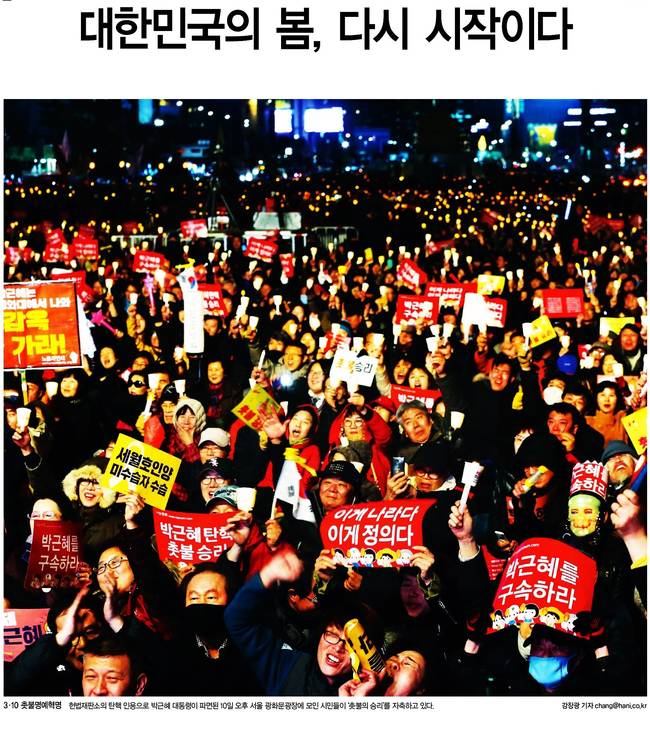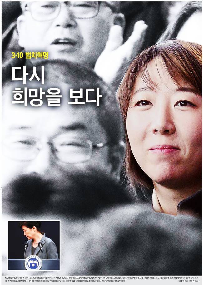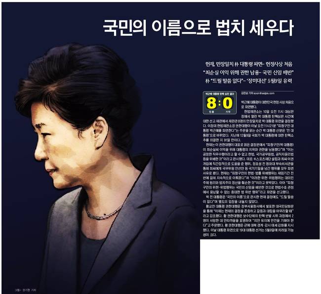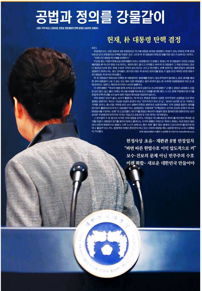 경향신문은 "주권자가 대통령을 이긴 ‘박근혜 파면’은 대반전이다. 시민의 결기가 법전 속에 잠자던 민주주의를 거리로 끌어냈다. 시민의 끈기가 멈칫거리는 국회와 검찰을 압박해 대통령을 법의 심판대에 세웠다"며 "1987년 민주화 이후 30년간 성장한 한국 민주주의는 새로운 성취를 이루며 또 한 단계 도약했다. 오늘의 승리를 이끈 네 글자는 헌법재판관들도 출발점으로 삼은 ‘주권재민’이다"고 보고했다.