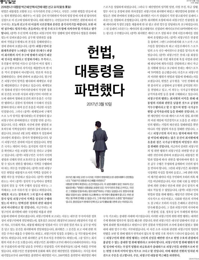 중앙일보는 '2016헌나1 대통령 박근혜 탄핵사건에 대한 선고 요지'를 1면에 담았다.
