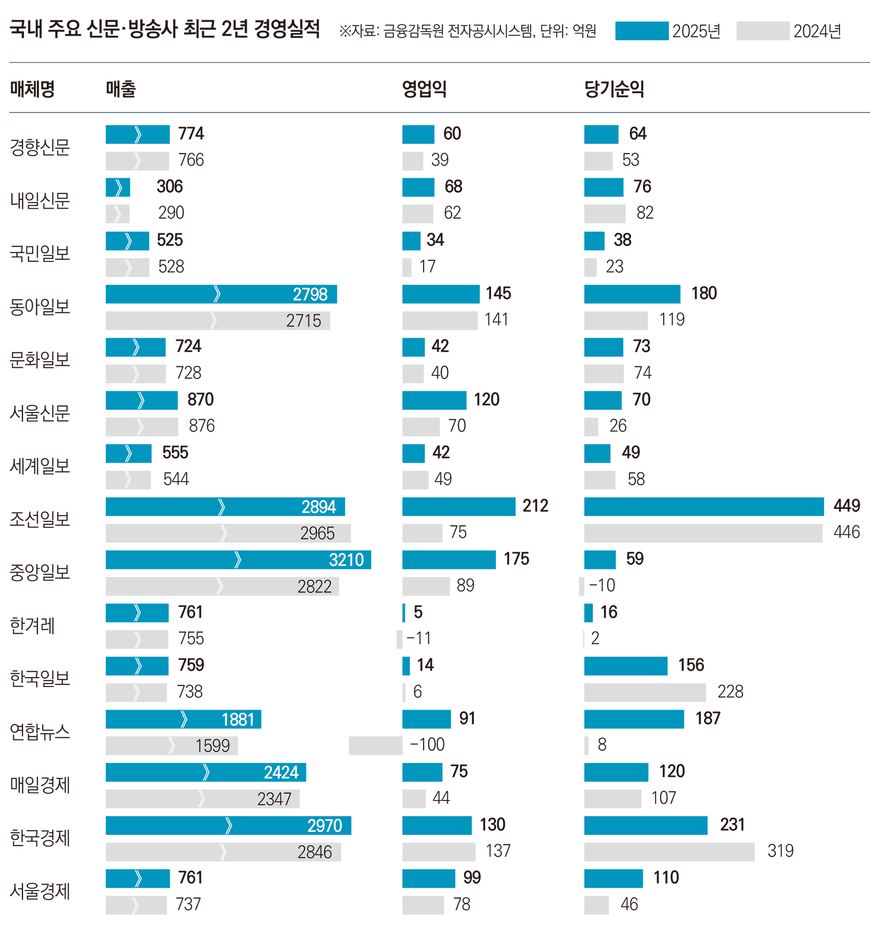 반면 조선일보는 매출이 3년 연속 감소하고 있는 추세다. 다만 영업이익은 전년 대비 182.7% 급증한 212억원을 기록해 조사 대상 언론사 중 영업이익 1위를 차지했다. 매출원가와 판매비·관리비 절약 등 긴축경영 기조가 확인된다. 조선일보 감사보고서에 따르면 매출원가는 2024년 1934억원에서 2025년 1798억원으로 약 136억원 감소했는데, 매출액 감소분(71억원)보다 원가 감소분이 더 커 결과적으로 매출총이익(1096억원)이 증가한 것이 주요하다. 또한 퇴직급여, 복리후생비, 임차료 등의 판관비 역시 전년보다 71억원 감소했다.