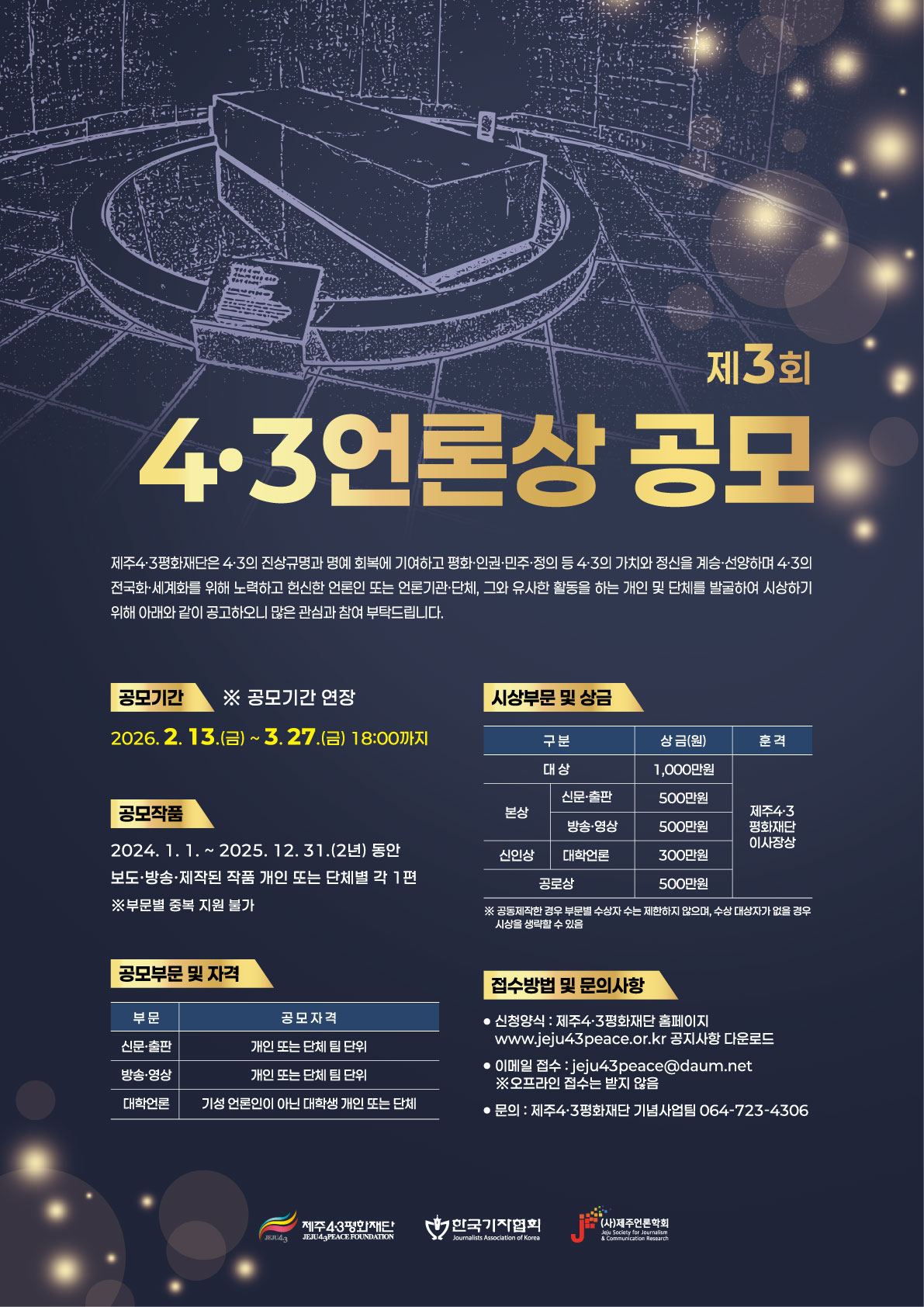 제주4·3평화재단은 4․3의 진상규명과 명예 회복에 기여하고 평화·인권·민주·정의 등 4․3의 가치와 정신을 계승·선양하며 4․3의 전국화·세계화를 위해 노력하고 헌신한 언론인 또는 언론기관·단체, 그와 유사한 활동을 하는 개인 및 단체를 발굴하여 시상하기 위해 아래와 같이 공고하오니 많은 관심과 참여 부탁드립니다.