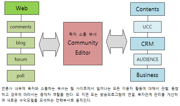 첫째, 독자와의 소통 전담 부서를 둘 것인가. 설치한다면 그것은 기자들에 의해 운용돼야 하는가, 아니면 온라인 파트에서 맡아야 하는가. 둘째, 독자 커뮤니티를 활성화하기 위한 온-오프 전략 즉, 크로스미디어 전략은 어떻게 마련돼야 하는가. 셋째, 독자(시청자)의 로열티(Royalty, 충성도)를 높여 비즈니스와 어떻게 연결할 것인가 등이다.