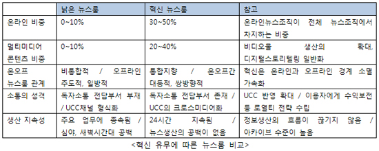 그러나 신문과 TV는 새로운 소비자를 대응하기에는 너무도 낡았다. 뉴스룸 종사자들의 온라인 참여도는 대폭 상향돼야 한다. 일정한 방문자 수와 유가부수를 확보한 뉴스룸이라면 전체 구성원 중에서 절반까지 온라인 뉴스 생산 및 서비스 조직을 구성해야 한다.