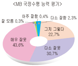 조사에 참여한 정치부, 경제, 사회부 기자 가운데 이 대통령의 국정 수행을 지지한 응답자는 1명도 없었다. 특히 경제부 기자들은 92.9%가 ‘잘못하고 있다’고 대답했다. 정치부 기자는 79.5%였다.