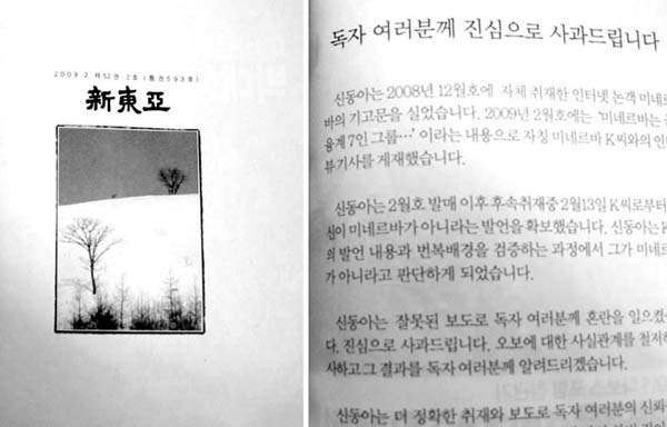 ▲ 신동아가 3월호를 서둘러 판갈이한 흔적이 엿보인다. 사진 왼쪽은 통상 신동아 본문 첫 장의 모습. 제호와 통권 호수, 사진이 보인다. 반면 오른쪽 3월호 첫 장에는 통상 실리던 고정물 대신 사과문이 게재됐다.