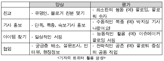 마이스페이스나 페이스북 같은 소셜 네트워크 서비스에 무관심했던 국내 기자들이 트위터를 직접 챙기려는 경향이 두드러지는 것은 접근성이 쉽고 편리하기 때문으로 보인다.