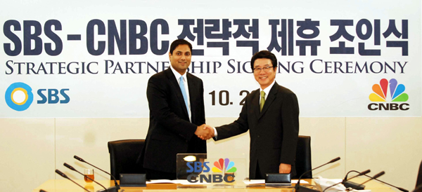 ▲ 새팔 브랜치(Satpal Brainch) CNBC 아시아·태평양 사장과 김기성 SBS CNBC 대표(오른쪽)가 지난 10월22일 서울 양천구 목동 SBS사옥에서 전략적 제휴 조인식을 가졌다. |