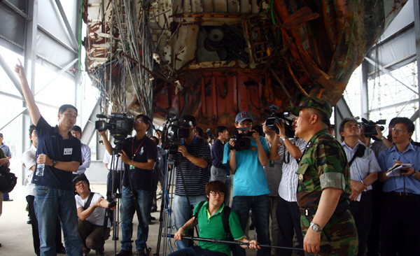 ▲ 합조단 관계자가 천안함 절단면에서 참석한 언론인들에게 브리핑을 하고 있다. (천안함 검증위 제공) |