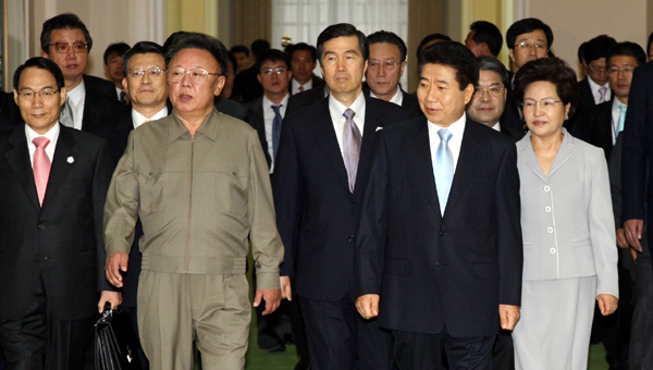▲ 노무현 대통령과 김정일 국방위원장이 2007년 10월3일 오전 수행원들과 함께 백화원 영빈관 정상회담장으로 들어서고 있다. |