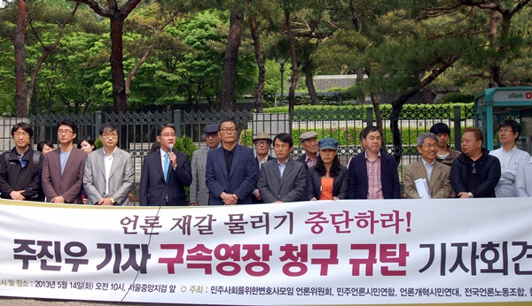 한국기자협회와 민주사회를위한변호사모임 언론위원회, 민주언론시민연합, 언론개혁시민연대, 전국언론노동조합은 14일 서울중앙지방검찰청 및 서울중앙지방법원 옆에서 ‘주진우 기자 구속영장 청구 규탄’ 기자회견을 열고 “언론에 재갈을 물리려는 행위”라고 비판했다. 주진우 기자도 10시 30분 서울중앙지법에서 열리는 영장실질심사를 받기 전 기자회견장에 잠시 들러 “잘 다녀오겠다”고 말했다. 검찰은 현재 주진우 기자가 ‘허위사실 공표’와 ‘사자 명예훼손’ 혐의에 따라 구속수사해야한다는 입장이다.
