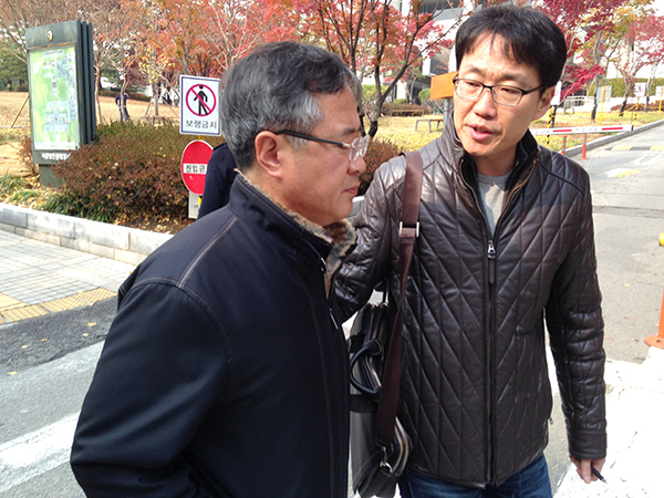 ▲ 15일 서울 서초동 서울중앙지법 앞에서 재판을 마치고 돌아가는 원충연 전 국무총리실 공직윤리지원관실 조사관(왼쪽)에게 임장혁 YTN노조 공정방송추진위원장이 질문을 하고 있다. |