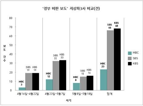 | ▲ 전국언론노조 MBC본부 민실위가 지난달 16일부터 이달 18일까지 통계 낸 지상파 3사 ‘정부 비판 보도’ 시기별 집계 및 합계. (그래픽=전국언론노조 MBC본부) | ||