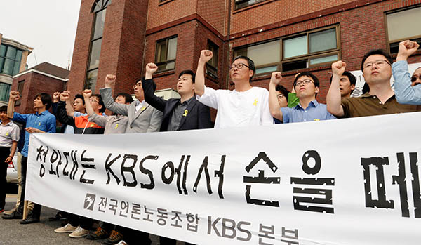 ▲ 지난 17일 오후 서울 종로구 자하문로 청운동사무소 앞에서 전국언론노조 KBS본부가 청와대의 KBS 보도 개입에 대해 박근혜 대통령의 사과와 청와대 이정현 홍보수석의 해임을 촉구하는 기자회견에서 구호를 외치고 있다. (뉴시스)