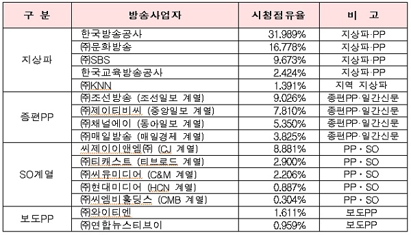 ▲ 2013년도 주요 방송사업자 시청점유율 산정 결과. (방송통신위원회) |