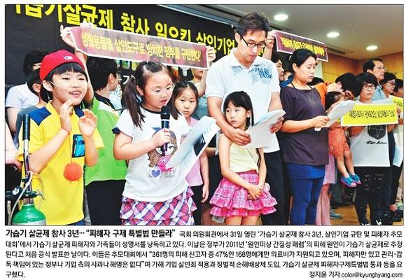 경향신문은 31일 국회 의원회관에서 열린 ‘가습기 살균제 참사 3년, 살인기업 규탄 및 피해자 추모 대회’ 사진을 게재하면서 “361명의 피해 신고자 중 47%인 168명에게만 의료비가 지원되고 있으며, 피해자만 있고 관리·감독 책임이 있는 정부나 기업 측의 사과나 해명은 없다”고 말하는 피해자 가족들의 말을 전했다.