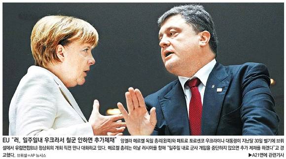 동아일보는 이날 1면 사진으로 앙겔라 메르켈 독일 총리와 페트로 포로센코 우크라이나 대통령이 EU 정상회의 개회 직전 대화하는 사진을 실으며 “메르켈 총리는 이날 러시아를 향해 ‘일주일 내로 군사 개입을 중단하지 않으면 추가 제재를 하겠다’고 경고했다”고 전했다.