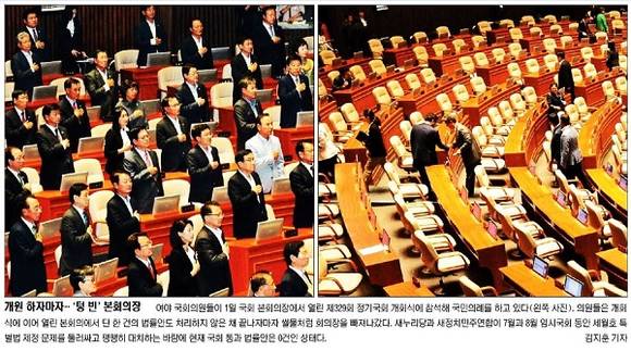 국민일보는 ‘개원하자마자…텅 빈 본회의장’이라는 제목의 사진을 통해 여야 국회의원들이 제329회 정기국회 개회식에 참석해 국민의례를 하는 모습과 본회의가 끝나자마자 썰물처럼 회의장을 빠져나가는 두 모습을 보도했다. 국민일보는 “의원들은 본회의에서 단 한 건의 법률안도 처리하지 않았다”며 “새누리당과 새정치민주연합이 7월과 8월 임시국회 동안 세월호 특별법 제정 문제를 둘러싸고 팽팽히 대치하는 바람에 현재 국회 통과 법률안은 0건인 상태”라고 보도했다.